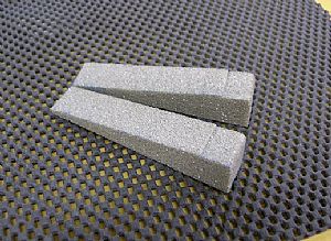 Cut out the foam wedges I cut out the wedge pattern from the plans and placed it one side of the foam black. I drew a line around the pattern with a fine point sharpie and cut the foam blocks out with my band saw. then I finished them off with my table top sander.