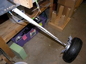 Mounting the tires on the main gear legs Here's one of the tires, mounted on the left gear leg. I used a large crescent wrench that I bought from Lowes Home and Aircraft Supply to tighten the VA-106 wheel nut on the axle. I tightened the wheel nut to the point that the wheel wouldn't rotate easily on the axle, just to seat the rim and bearings in place. Then I backed the nut off a little, just enough to allow the tire to rotate on the axle without any notable friction. Then I used a spring loaded center punch to mark the axle for the 1/8 inch I needed to drill for the cotter key. Then I removed the tire, drilled the holes in the axle and mounted the tire again. Sorry, I forgot to take pictures of the drilling process. The hairy leg on the right side of the picture is mine, not my wifes.