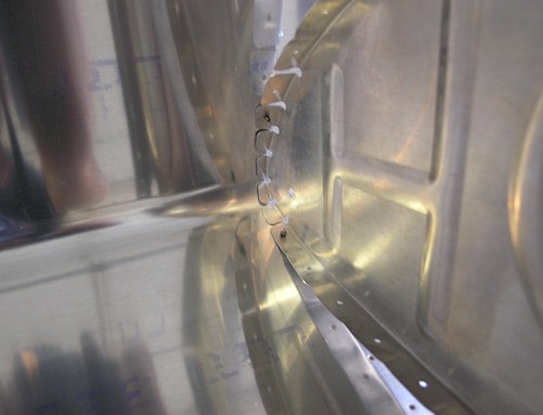I think this is going to work! Now all the ribs are clecoed in down the line with the first two holes clecoed to the skin.