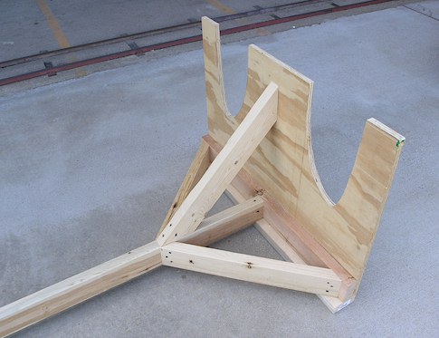 Here’s where a compound miter power saw is indeed a necessity. It makes cutting these 45 degree angles a breeze. I cut two 2x4’s, 23 inches long (outer edge to outer edge) for the 2 bottom angle braces, and one 2x4, 25 inches long (outer edge to outer edge) for the top angle brace. Then it was just a matter of screwing it all together with my electric drill, with a Phillips screw driver bit. I used my framing square to make sure that the plywood was lined up at a 90 degree to the main 2x4 support before screwing in the first bottom brace.